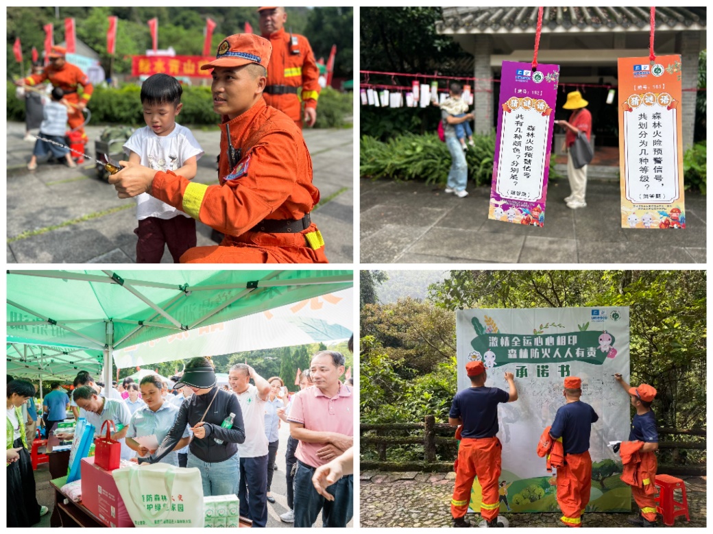 此外,活动主会场还设置了森林防火装备展示区、无人机体验区、政策法规宣传区等互动区域。森林消防大队现场演示了风机灭火、高压水泵等装备操作,市民可亲手体验消防器材;无人机展区通过飞行演示展现科技防火的高效监测能力;防火猜谜区则通过趣味问答普及防火法规,参与者答对即可获得定制保温杯、雨伞等礼品。活动融合“生态+全运”元素,吸引众多游客驻足参与。