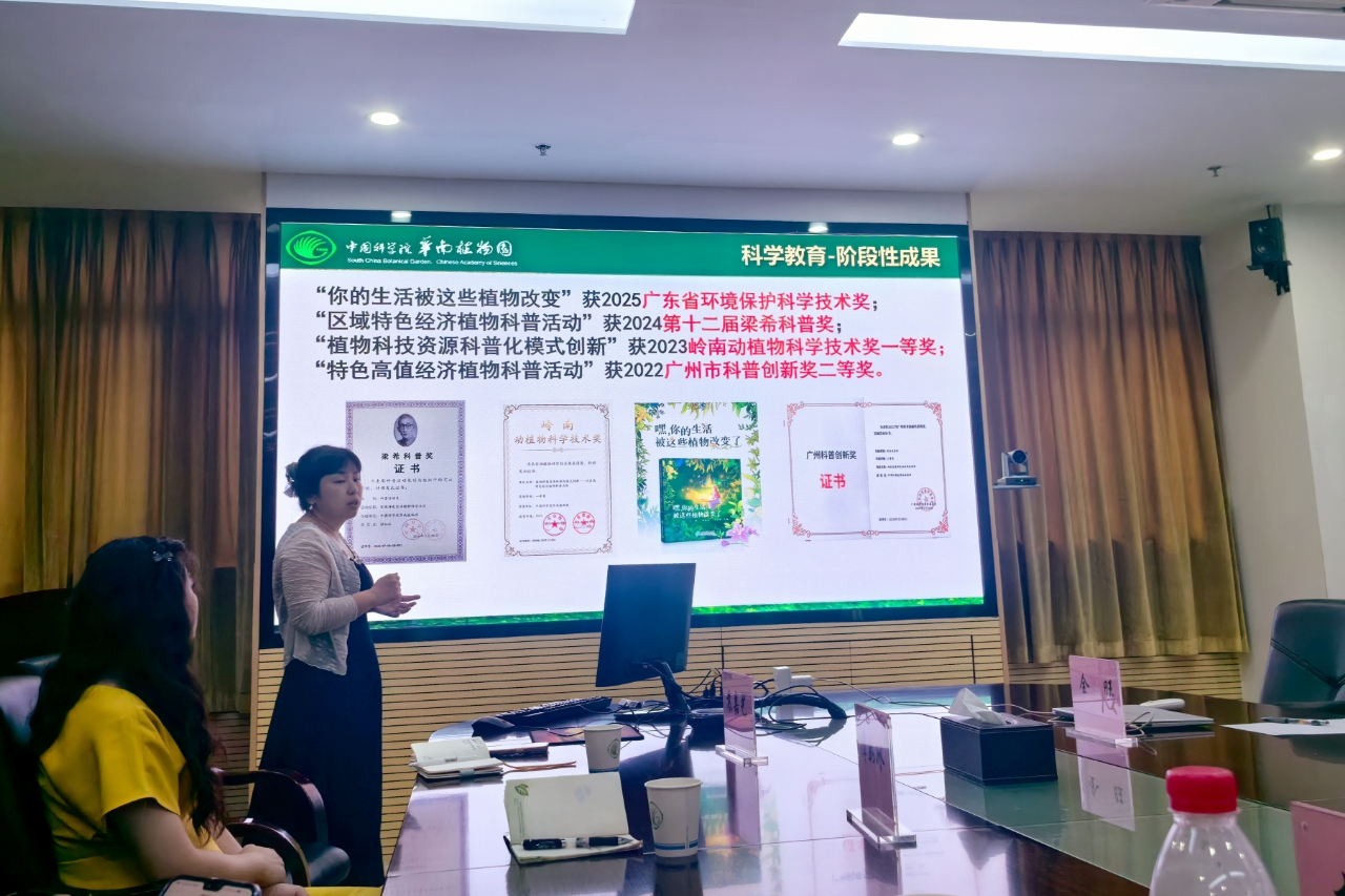 交流会上,杨子银对徐海一行的到来表示热烈欢迎。双方分别围绕各自开展的特色科学教育工作、展馆建设、工作规划等内容作汇报交流。广州生物医药与健康研究院健康院综合处副处长王炯坤、综合处信息宣传主管胡冰鑫分别汇报了广州健康院的科学教育工作进展和专业科学博物展馆的规划建设方案;华南国家植物园园地管理处科普旅游部副部长谭如冰汇报了园地管理处的系列科普成果;鼎湖山国家级自然保护区管理局科教科科长彭丽芳汇报了科学教育“鼎湖山模式”的探索和实践。华南植物园标本馆高级工程师刘运笑介绍了近年来围绕植物科学画等开展的系列展览和科普活动等。
