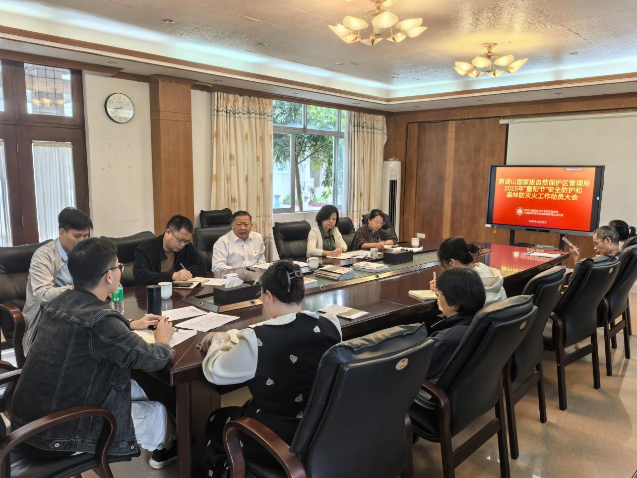 10月28日上午8时15分,鼎湖山保护区召开2025年重阳节期间安全防护和森林防灭火工作动员会议,保护区全体员工、定位站驻站员工和志愿者代表近50人参会。会议宣读了《2025年“重阳节”安全防护和森林防灭火工作方案》,宣布应急扑火队人员组成,成立了以鼎湖山保护区局长王克亚为组长的领导小组,并创新融合志愿者力量,构建群防群治的“全民防火墙”。王局长在动员讲话中,结合到任四个月来的亲身经历,真挚感谢全体员工的辛勤付出,并号召大家团结一致,服从安排,以高度的责任感与使命感投身防护工作,共同守护鼎湖山的绿色家园。