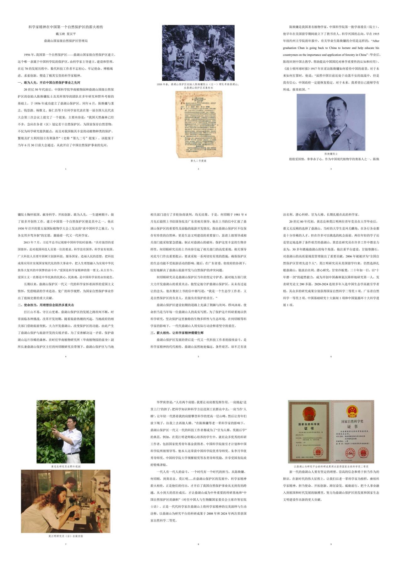 《科学家精神在中国第一个自然保护区的薪火相传》一文,深入挖掘了鼎湖山保护区自1956年成立以来的故事,讲述一代代科学家勇于开拓创新,艰苦奋斗,为保护和研究南亚热带常绿阔叶林及其生物多样性所做出的贡献,生动展现了科学家精神在这片土地上的传承与弘扬,对公众、学生群体了解植物科学研究背后的人文精神起到了积极激励作用。